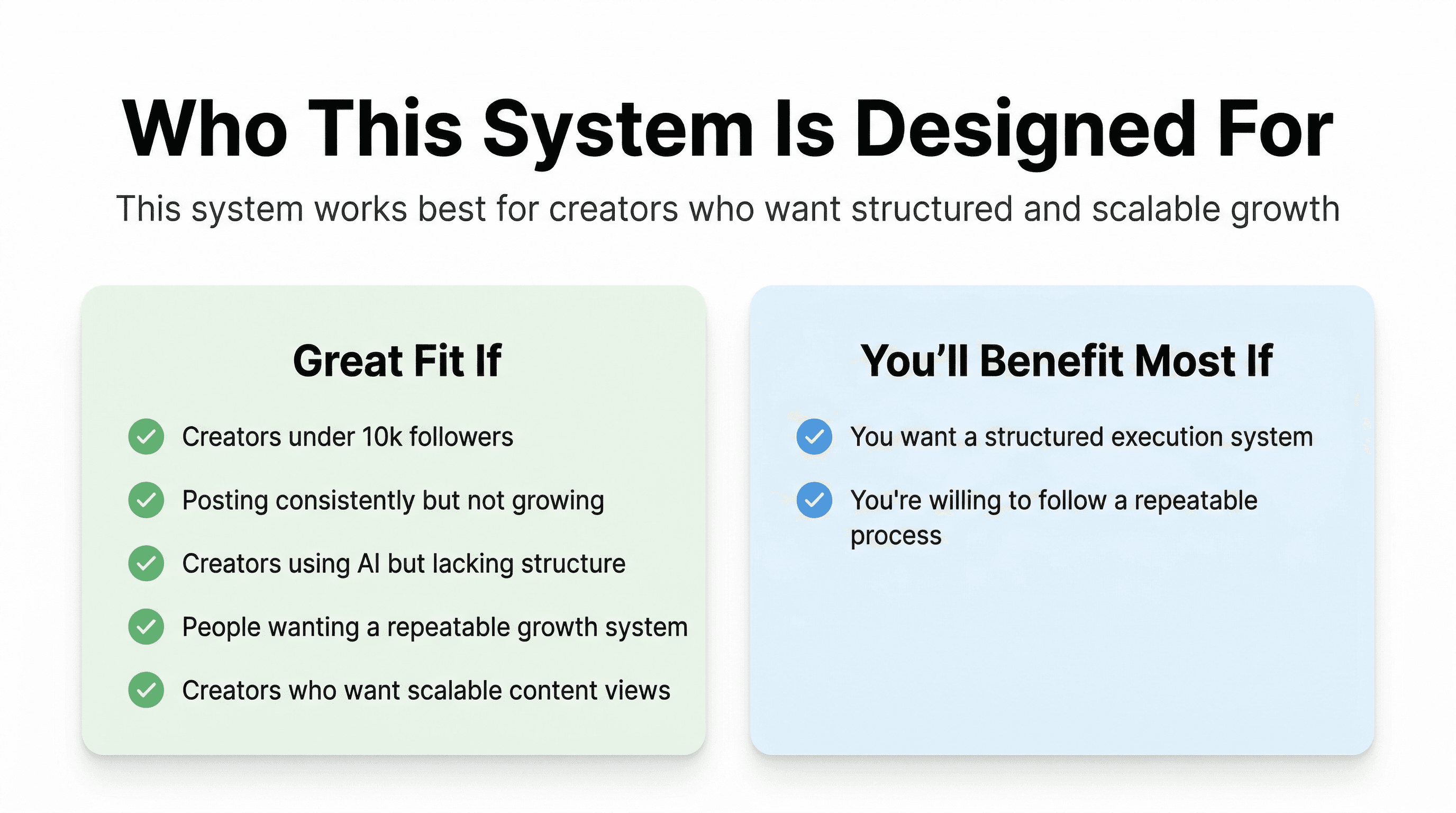 ✔ Creators under 10k followers ✔ People posting consistently but not growing ✔ Creators using AI but lacking structure ✔ Creators who want scalable growth